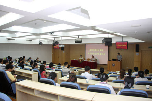 最后,院长邓力平就创先争优公开承诺提出希望。邓院长指出,当前学院发展进入了关键时期,广大党员干部作为推动学院科学发展的重要力量,在学院党支部和党员中深入开展创先争优活动,对于推动学院中心工作具有重要意义。他希望各支部和党员认真履行承诺,在工作中当先进、作表率,努力为做好高端业务拓展工作和推进学院跨越式发展做出积极的贡献。