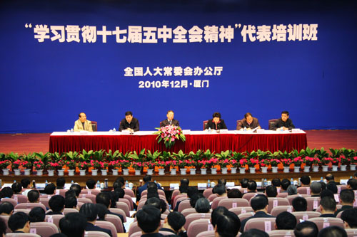2010年12月8日至20日,全国人大常委会办公厅在我院举办第2期、第3期“学习贯彻十七届五中全会精神代表培训班”。来自北京、天津、河北、山西、解放军等共33个选举单位约800名全国人大代表参加了学习。