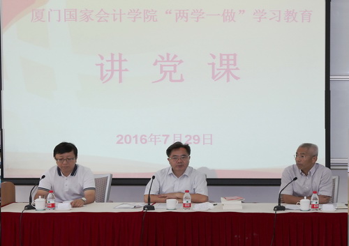 刘书记首先指出,加强政治学习是提高思想觉悟的唯一途径。在“两学一做”学习教育中,广大党员要把学习党章党规、学习习近平总书记系列重要讲话与自身实际和本职工作结合起来学,只有不断地加强政治学习,坚持以知促行,才能提升自身政治理论水平和工作能力。接着,他重点谈了对“不忘初心、继续前进”的理解和学习体会。他认为,不忘初心,要做到三个“不忘”:不忘自己是一名共产党员、不忘党的事业、不忘为党的事业努力奋斗。最后,刘书记指出,学院是培养会计和财税行业高端人才的重要基地,广大党员同志要把党的事业和学院事业、自身工作结合起来,有担当,真抓实干,无私奉献。
