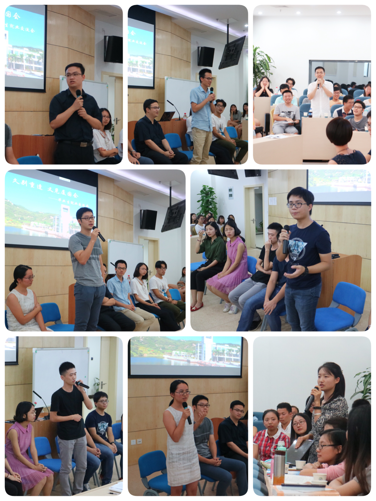 首先,来自厦门国网电力的廖倩云、厦门烟草工业有限责任公司的詹栋培、漳州投资集团的严跃辉、厦大在读博士生李文文、中国船级社福州分社的潘骞七位同学着眼于各自的求职经验、心得体会以及毕业后的工作经历与大家展开了交流。通过交流,在校的同学们对相关行业有了新的认识并产生了浓厚的兴趣。在接下来的自由提问环节,同学们更是抓住这次难得的机会,向台上的学长们请教各种学习与就业相关的问题。在谈到研究生期间所学内容对工作的重要作用时,几位校友高度评价学院以案例为主的教学方式,他们认为这种方式帮助他们工作后迅速适应了岗位的需要,并且对整个工作过程产生了深远的影响。校友们结合自己的工作实际,提醒大家会计工作信息化的重要性,建议大家加强这方面的学习。