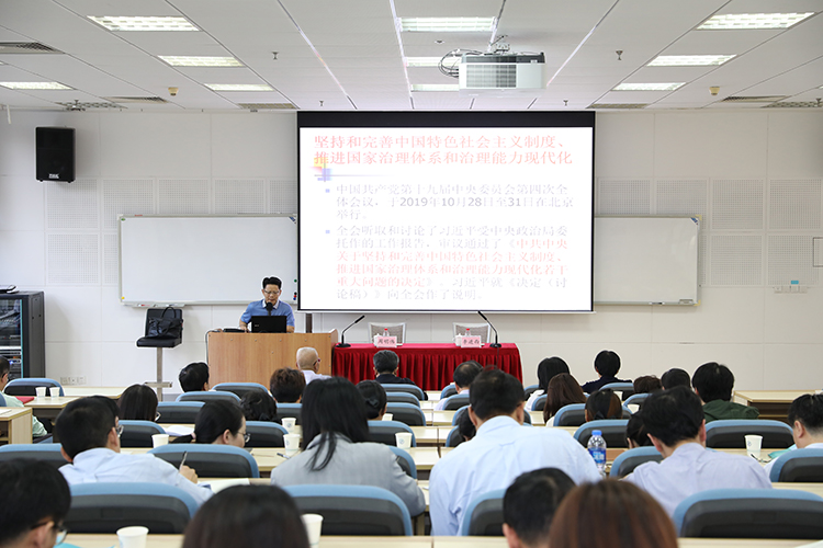 周明伟教授紧紧围绕十九届四中全会上习近平同志受中央政治局委托所作的工作报告,以及全会审议通过的《中共中央关于坚持和完善中国特色社会主义制度、推进国家治理体系和治理能力现代化若干重大问题的决定》,从党的十九届四中全会精神的“重大意义”“丰富内涵和核心要义”“重在落实”等三大方面对党的十九届四中全会精神进行系统阐释和深入解读。党的十九届四中全会,是我们党站在“两个一百年”的奋斗目标历史交汇点上召开的一次具有里程碑意义的重大会议。我国正处在实现中华民族伟大复兴的关键时期,要不断满足人民对美好生活的向往、战胜前进道路上的各种风险挑战,就必须在坚持和完善中国特色社会主义制度、推进国家治理体系和治理能力现代化上下更大功夫。周教授的讲解深入浅出,内容主题鲜明,对全体教职员工更好地学习领会十九届四中全会精神有较强的指导作用。
