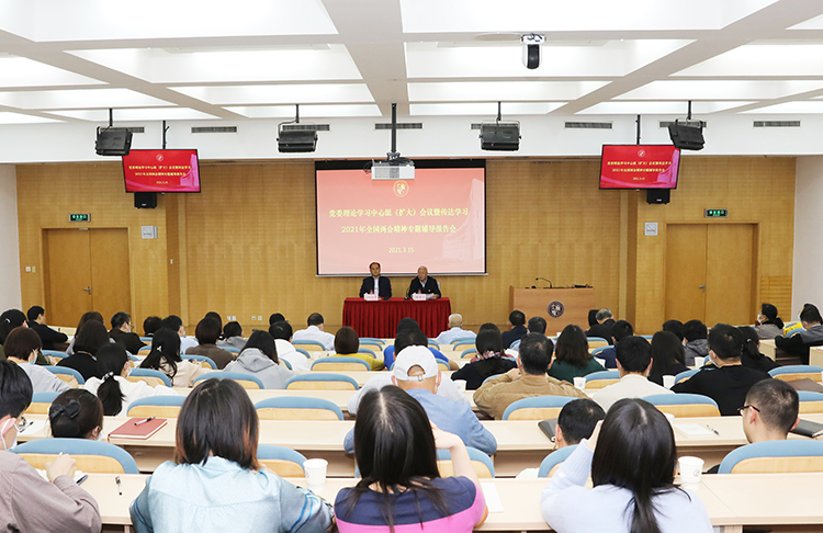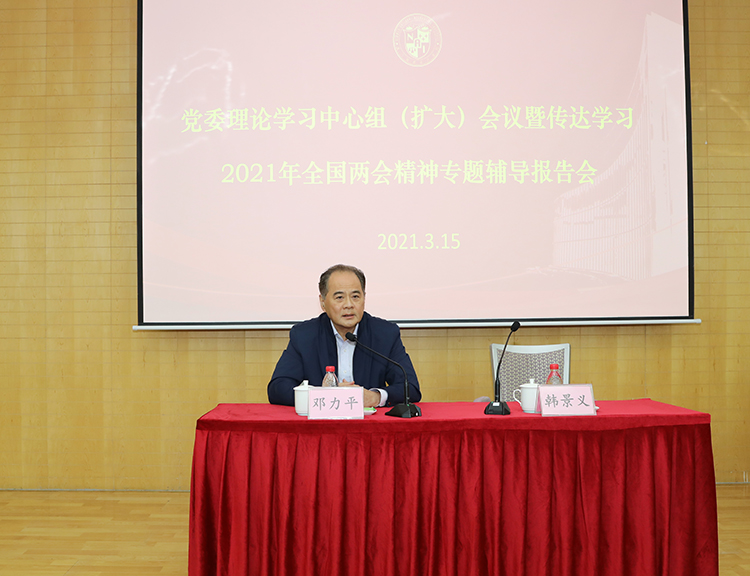 3月15日下午,学院召开党委理论学习中心组(扩大)会议暨传达学习2021年全国两会精神专题辅导报告会,邀请全国人大常委会委员、我院邓力平教授做学习2021年全国两会精神专题辅导报告。会议由学院党委书记韩景义主持,院领导班子成员和全院教职员工参加会议。