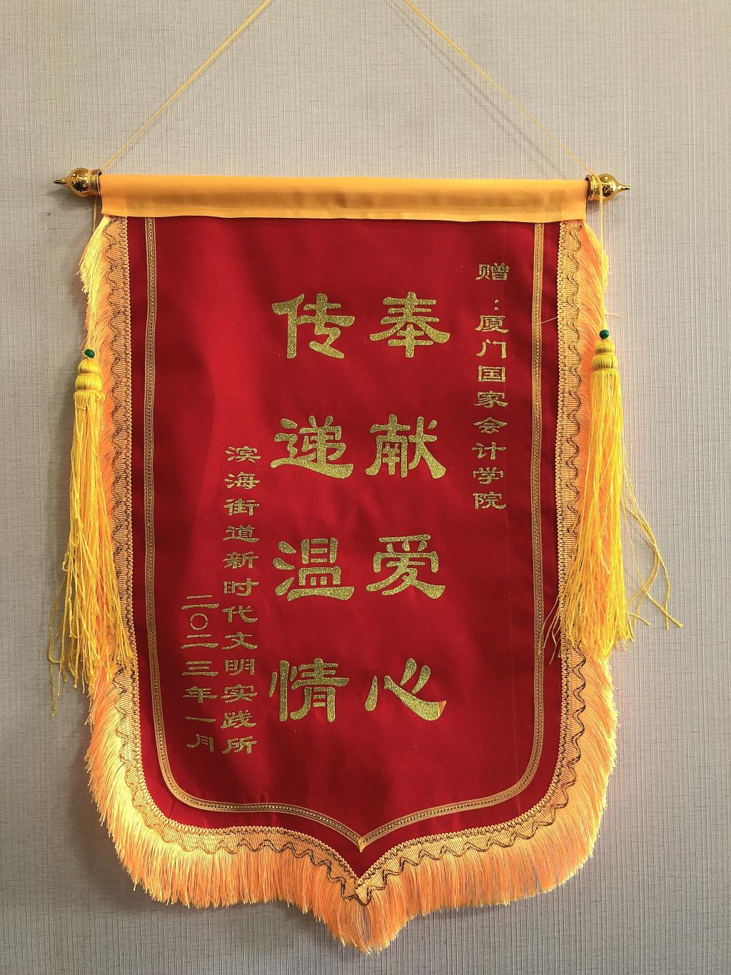 2020年6月,学院与驻地的黄厝社区居委会签订共建协议,制定“双报到”项目清单,两年多来,学院积极组织和参与社区各类学雷锋志愿服务活动,得到了社区群众的一致好评,滨海街道为学院颁发了“奉献爱心,传递温情”锦旗。