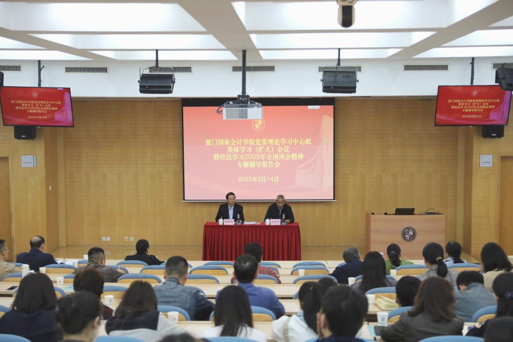 3月14日上午,厦门国家会计学院召开党委理论学习中心组集体学习(扩大)会议暨传达学习2025年全国两会精神专题辅导报告会,邀请十四届全国人大代表、厦门市政协副主席、学院黄世忠教授传达习近平总书记在全国两会上的重要讲话精神和全国两会精神。受正在中央党校学习的学院党委副书记、院长丁友刚委托,党委委员、副院长李进西主持会议并讲话,党委委员、副院长邓建平和全院教职员工一同聆听报告。