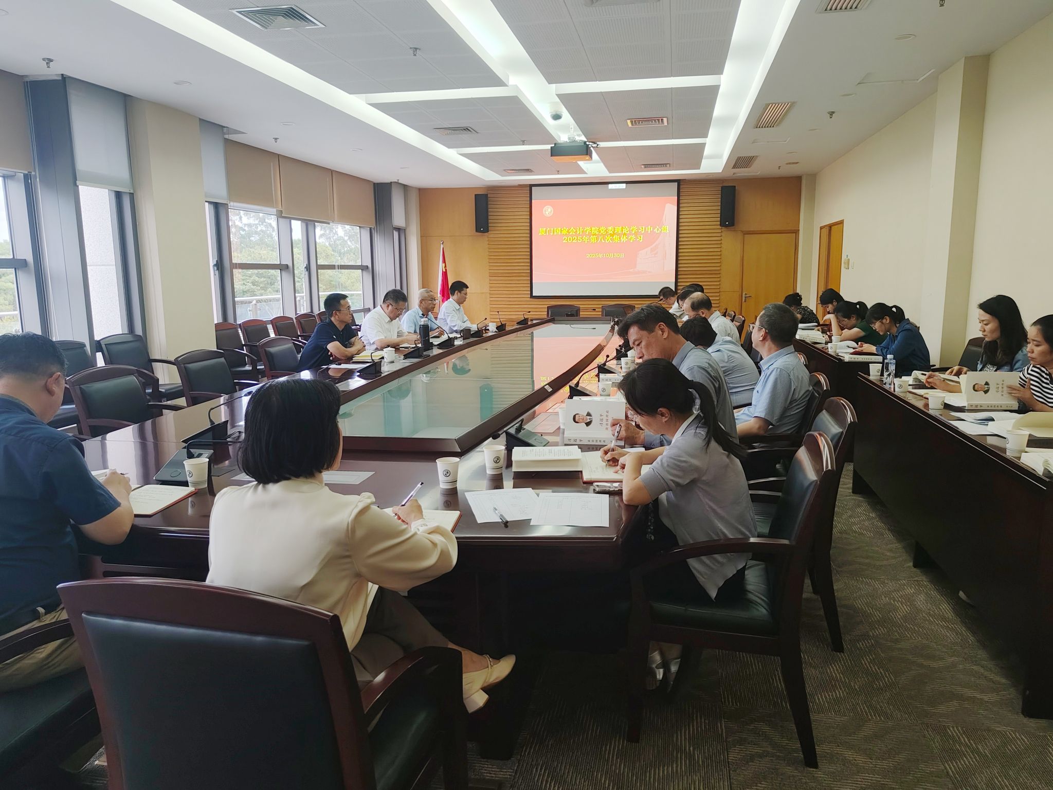 10月30日,厦门国家会计学院党委理论学习中心组召开2025年第八次集体学习会议,深入学习《习近平谈治国理政》第五卷。学院党委副书记、院长丁友刚主持会议并作总结讲话,院领导班子成员、全体处级干部及各教工党支部书记、副书记、组织委员参加学习并开展交流研讨。