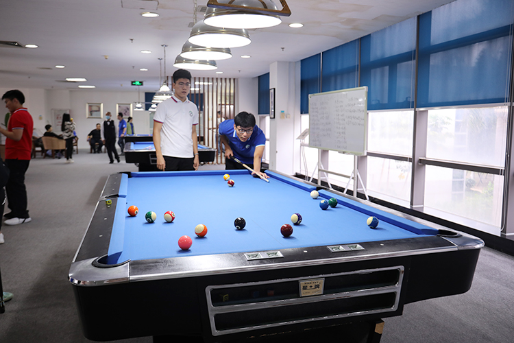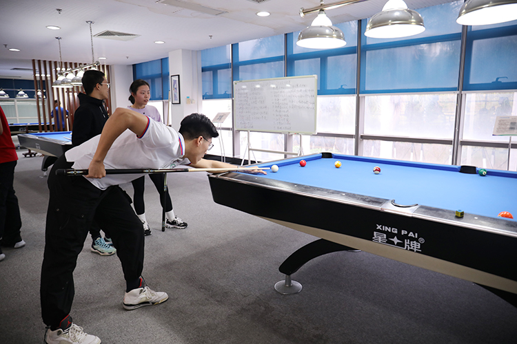 镜头转向台球场,与其他赛场不同的是,这里更需要安静与专注,只见选手们各个聚精会神,缜密布局,观察形势,找准角度,反复瞄准,再准确出击,展现了精湛的台球技艺。观众们屏住呼吸,目光追随着台上四处滚动的小球,为选手漂亮的出杆连声称赞。
