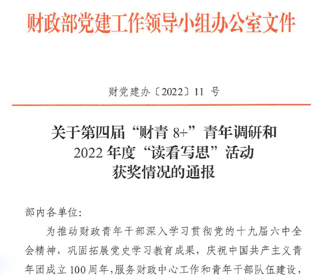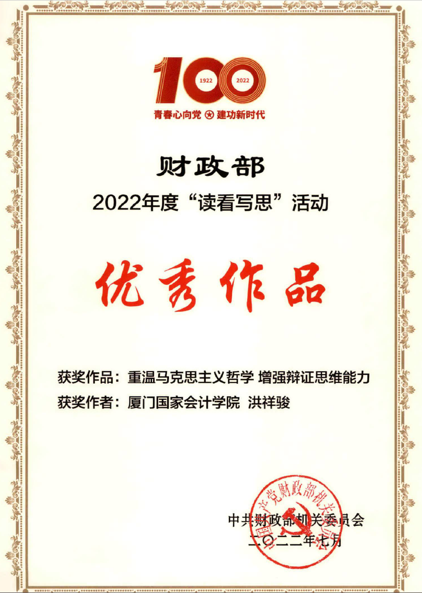 日前,财政部党建工作领导小组办公室对第四届“财青8+”青年调研获奖作品和2022年度“读看写思”活动优秀作品进行通报表彰,学院“一带一路”财经发展研究中心洪祥骏老师撰写的文章《重温马克思主义哲学增强辩证思维能力》获得了财政部2022年度“读看写思”活动优秀作品奖。