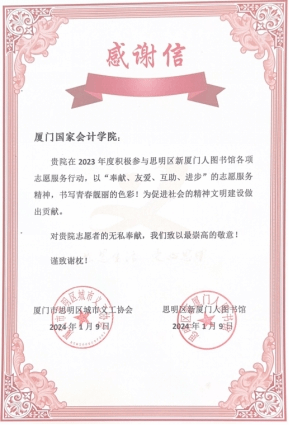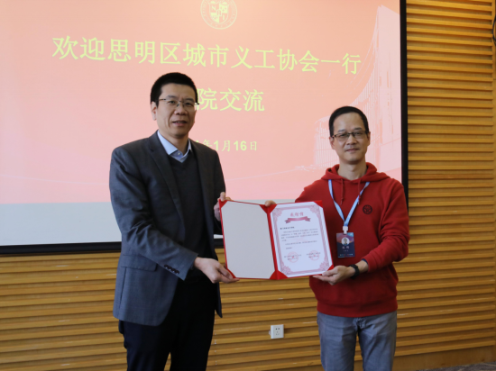1月16日,厦门市思明区城市义工协会秘书长陈伟一行4人莅临学院,为学院送来感谢信,肯定和赞扬学院青年志愿者们积极参与新厦门人图书馆的各项志愿服务行动。学院党委委员、副院长邓建平和团委干部热情接待来宾,并座谈交流。